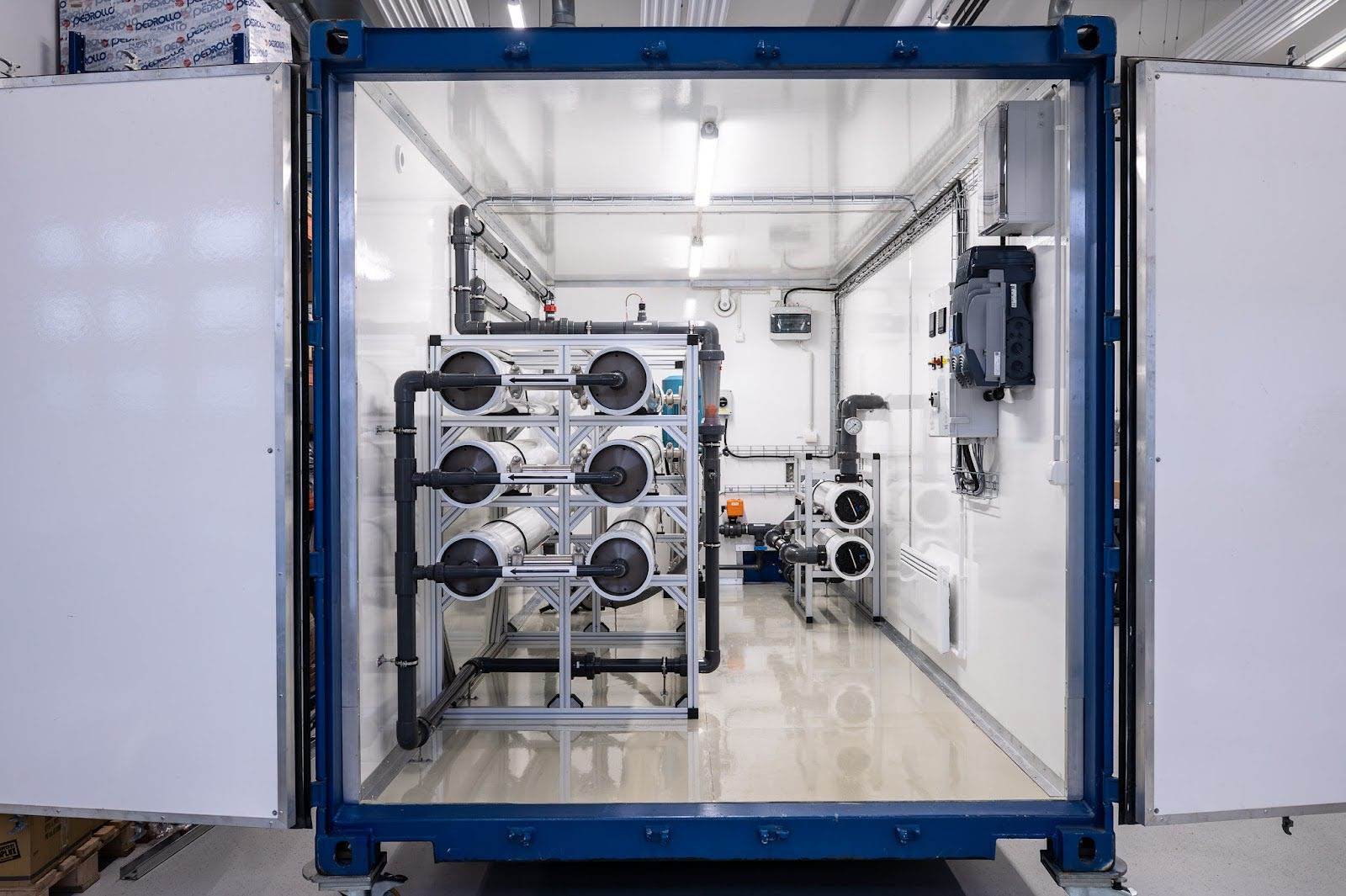 A containerized SolarRO desalination system was delivered, offering a daily production capacity of 500 m³. The unit includes an AFM glass media filtration system for efficient pre-treatment and is optimized for decentralized, off-grid operation. Designed for autonomous performance, the system integrates direct solar power and can operate independently without batteries or external power.